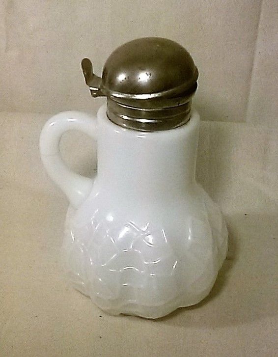 Title (ebay affiliate link): DITHRIDGE Opalescent Milk Glass Syrup Molasses Pitcher ALBA SPIDER WEB