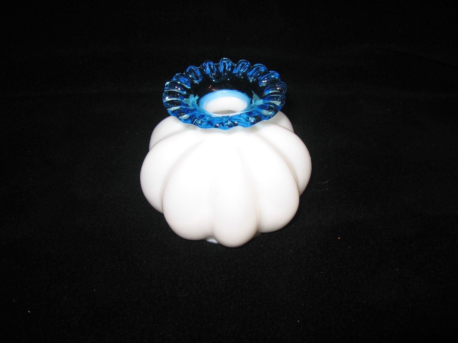 Title (ebay affiliate link): Vintage Aqua Blue Crest Milk Glass Bud Vase or Candle Holder