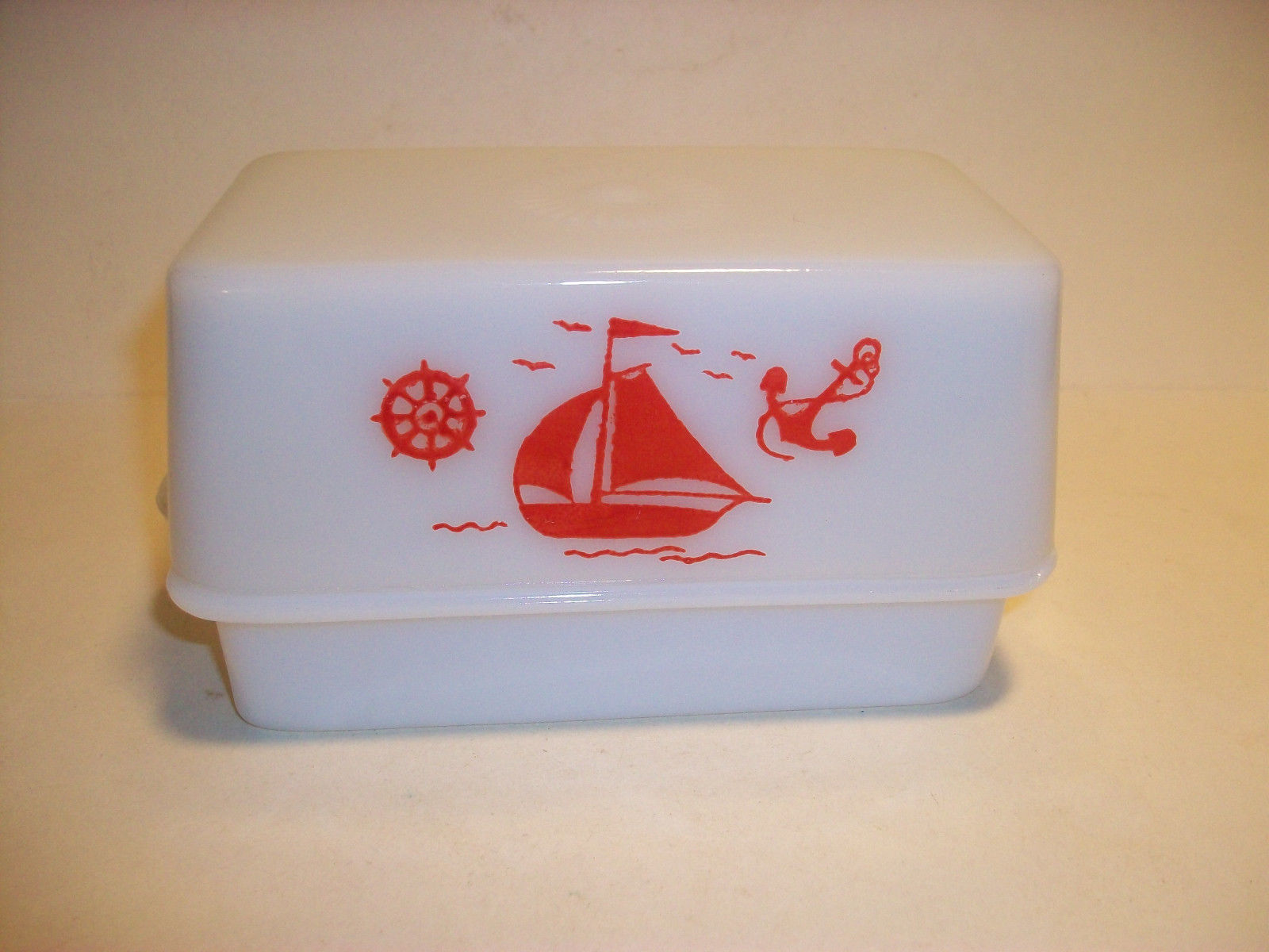 Title (ebay affiliate link): MCKEE MILK GLASS WITH RED SAILBOATS ANCHOR SHIP WHEEL BUTTER DISH WITH COVER
