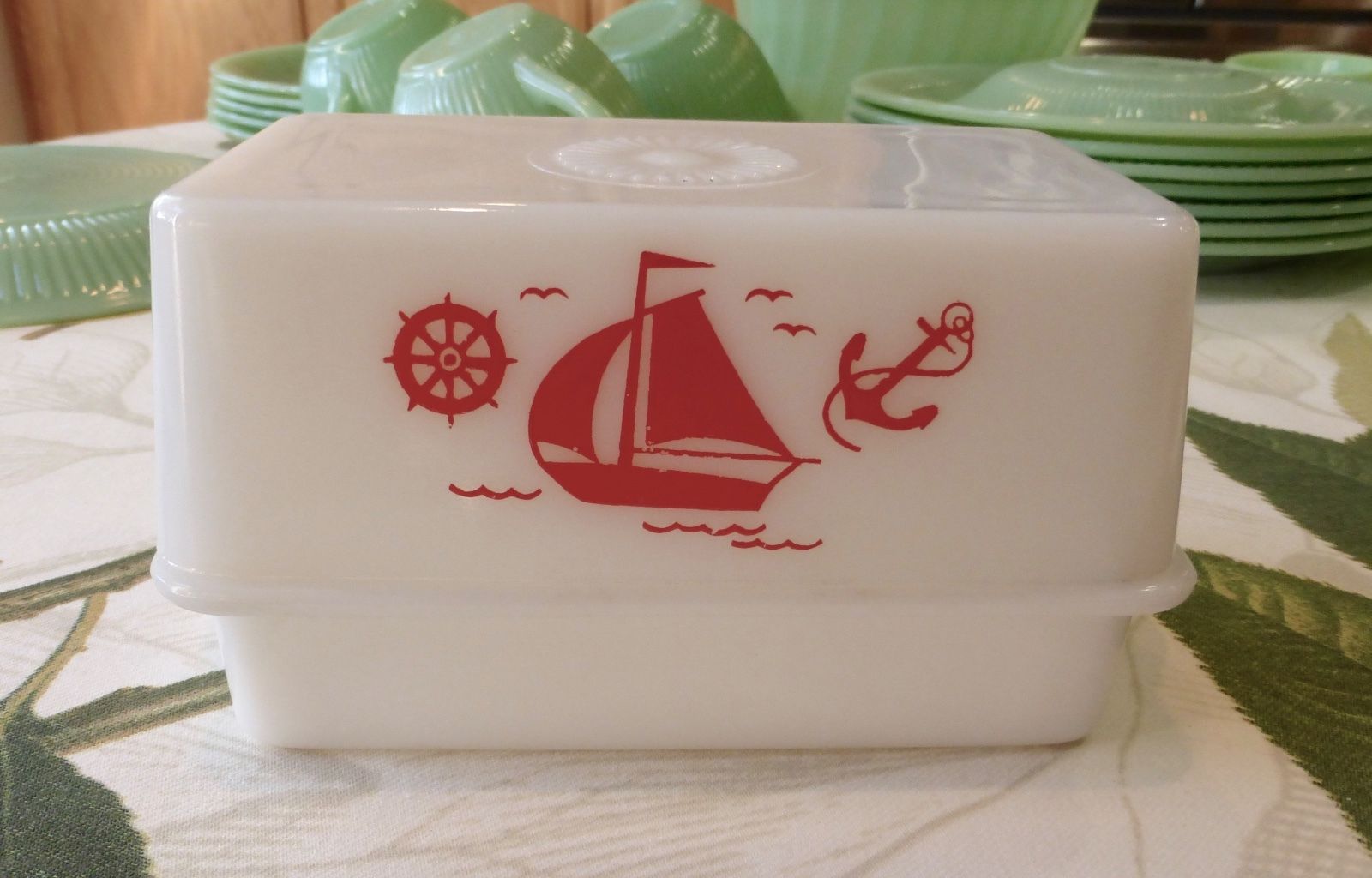 Title (ebay affiliate link): McKee White Milk Glass Red Sailboats Ships Pattern 1 Pound Butter Dish & Cover