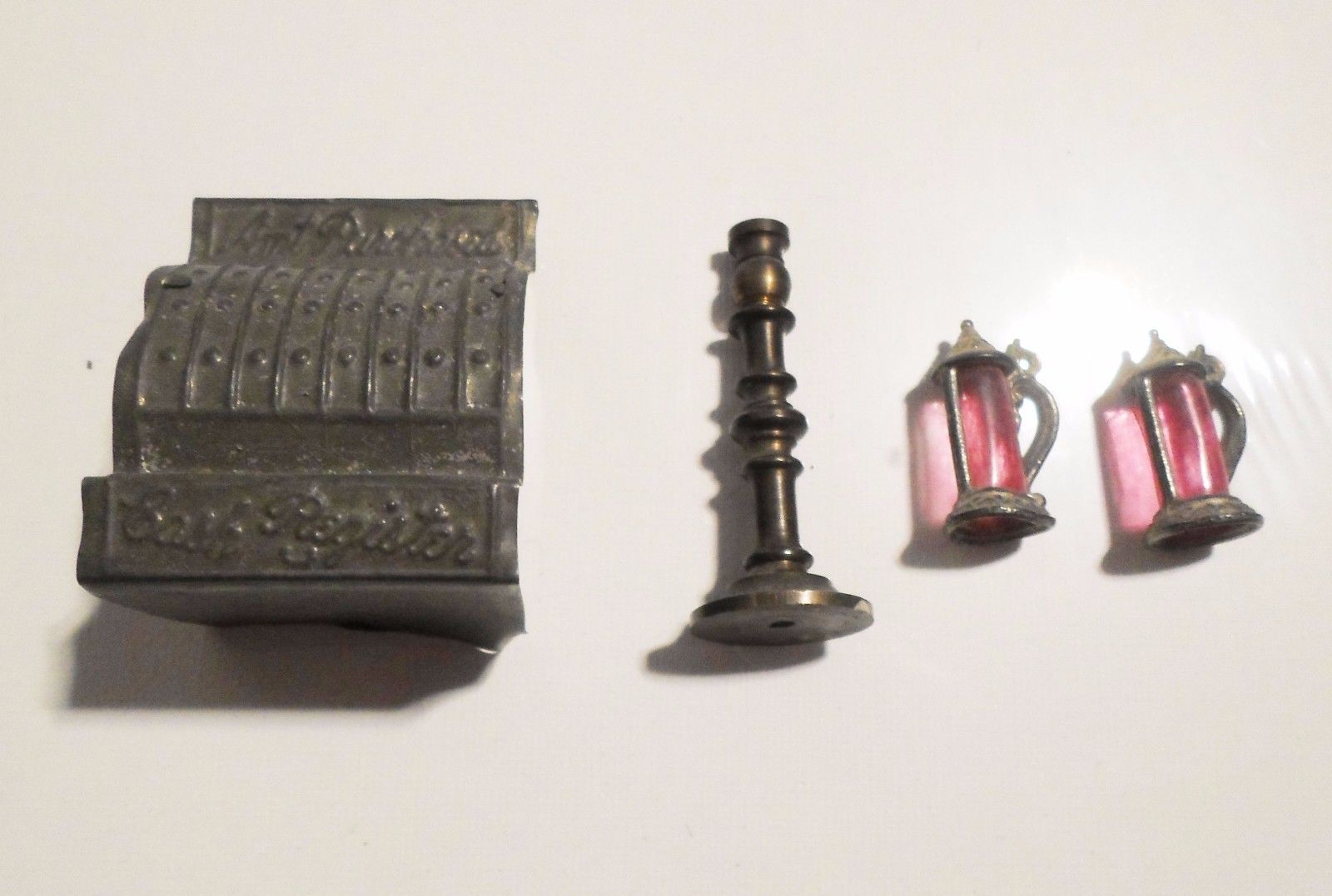 Vintage Mid-Century Toy Lot Register Tin & Candlestick Two Mugs Doll House Toys