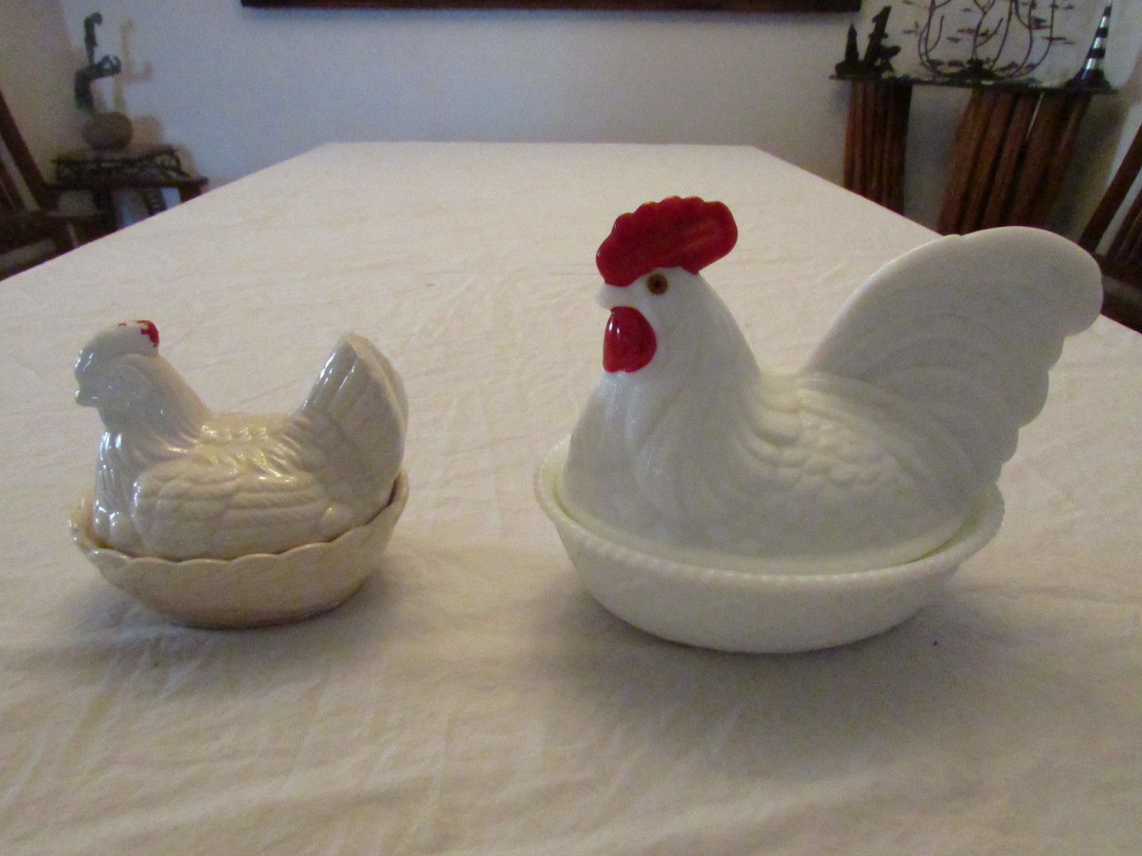 Title (ebay affiliate link): VINTAGE MILK GLASS ROOSTER/CHICKEN GRAVY BOWL + SMALLER PIECE