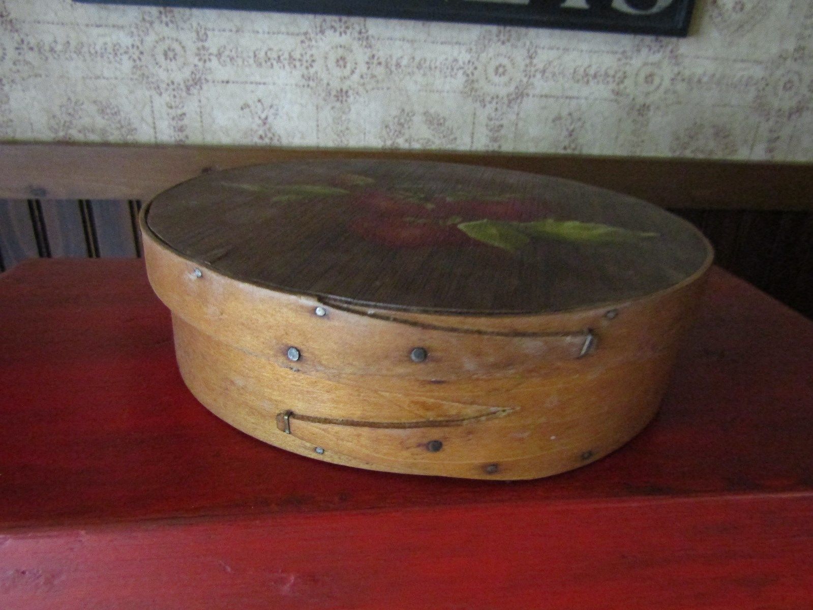Title (ebay affiliate link): VINTAGE WOODEN PANTRY BOX W/3WOOD FINGER JOINTS-PAINTED STRAWBERRIES ON TOP