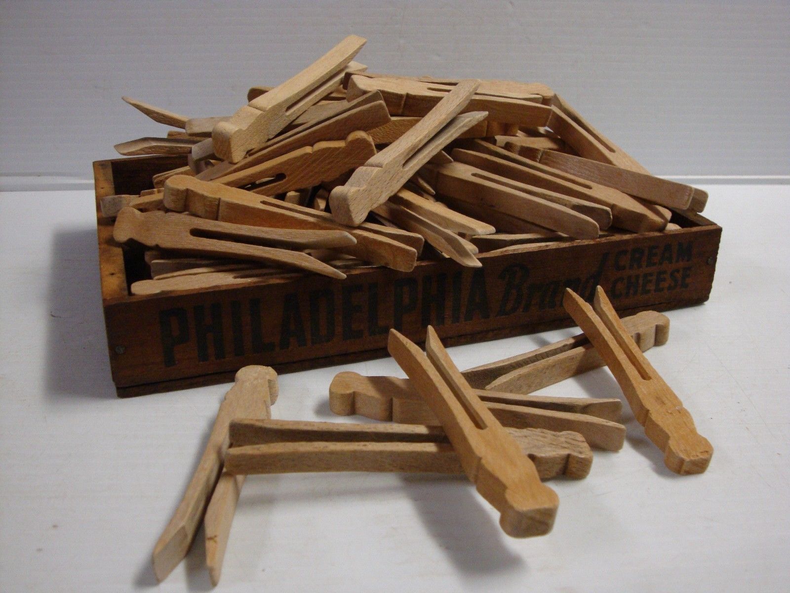 Title (ebay affiliate link): 100 ANTIQUE/PRIMITIVE WOODEN FLAT FACE CLOTHES PINS w PHILADELPHIA CHEESE BOX