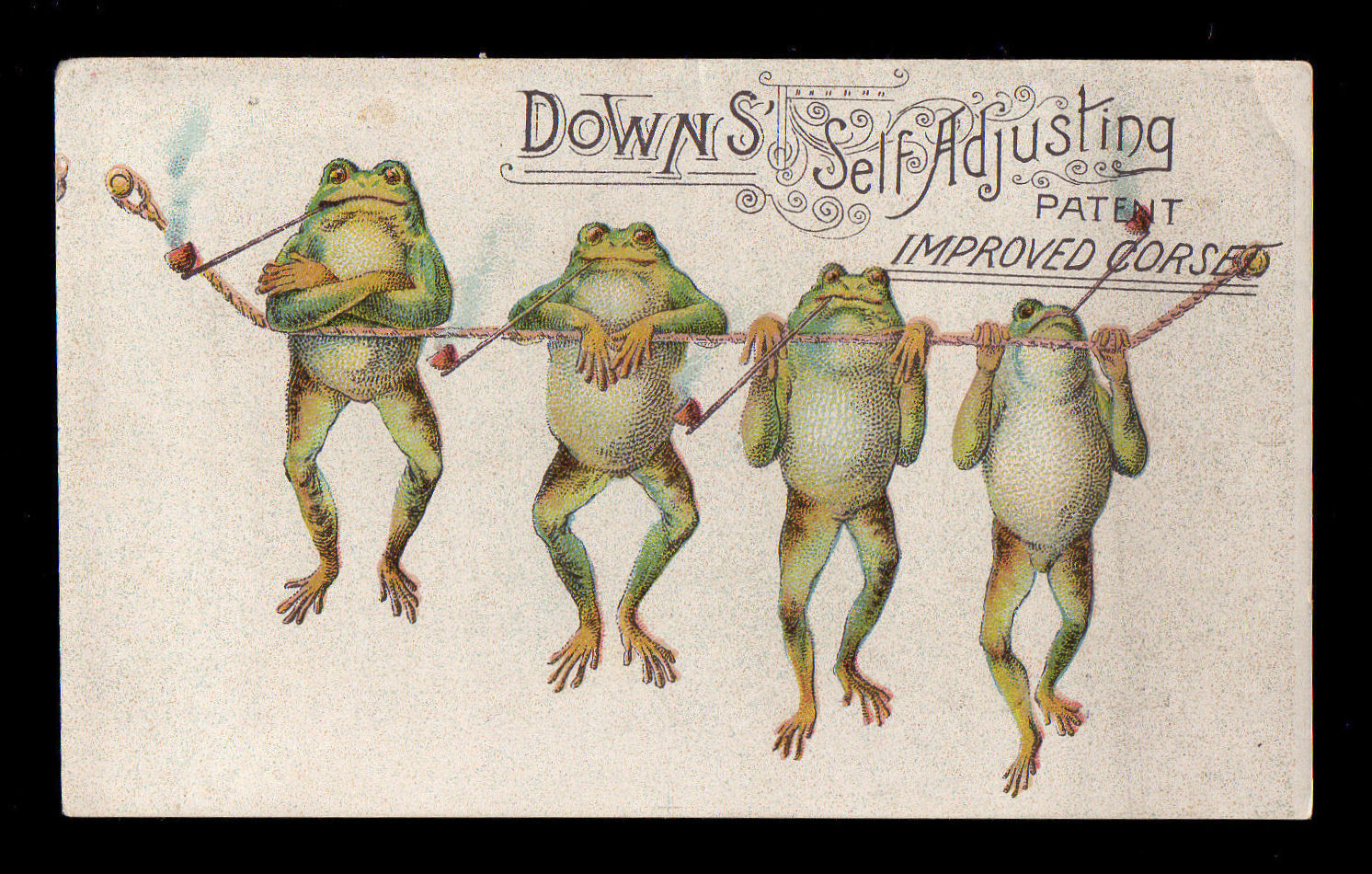 RARE 1880s TRADE CARD - PIPE SMOKING FROGS - DOWN'S CORSETS - TURNER, ILLINOIS