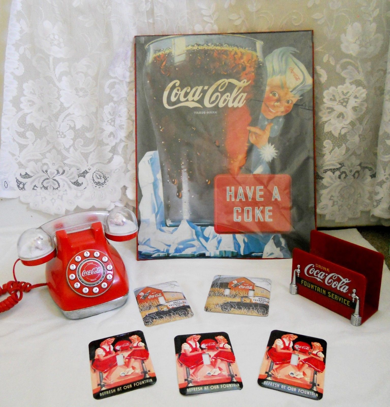 Title (ebay affiliate link): Lot of 8 pcs Coca Cola Collectibles Red telephone have a coka sign light switch