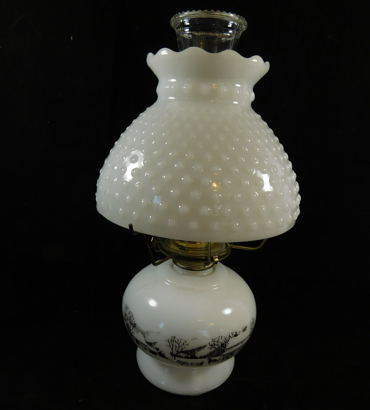 Title (ebay affiliate link): Vintage Currier & Ives Milk Glass Hurricane Lamp Black White Winter Shade & Base