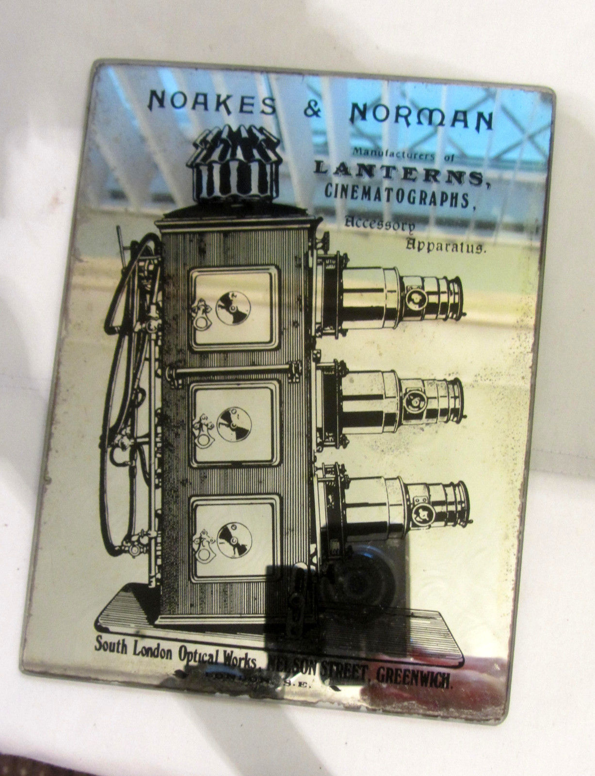 Antique advertising mirror magic lantern cinematograph glass Noakes & Norman