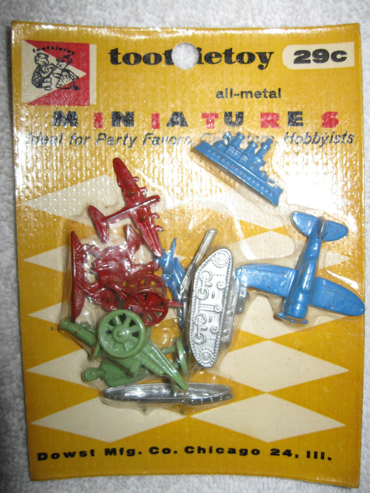 Title (ebay affiliate link): 1940s-50s Miniature Metal Tootsie toys WWII Ships Planes Figures Cannon Etc MOC