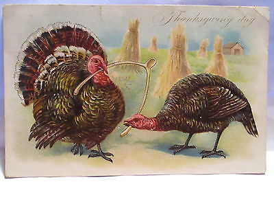 1910 TUCK POSTCARD THANKSGIVING DAY, 2 TURKEYS TUGGING WISHBONE