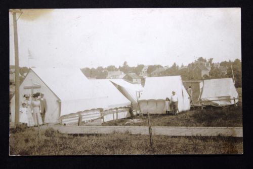 c.1910 RPPC Postcard People in Fancy Clothes Outside Tents in, East Boothbay Me.
