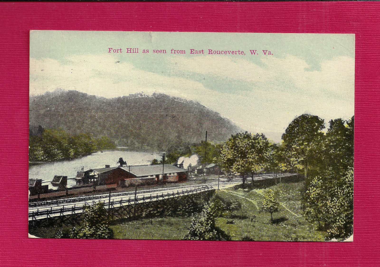 East Ronceverte, WV, pc, postcard RailRoad yard, Greenbrier River and Fort Hill