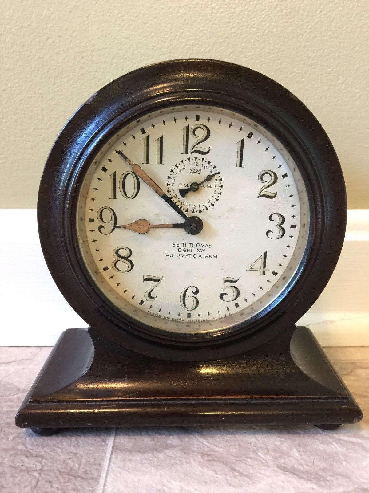 Title (ebay affiliate link): Vintage Antique SETH THOMAS 8 DAY Automatic ALARM CLOCK IN WOOD CASE moon AM PM
