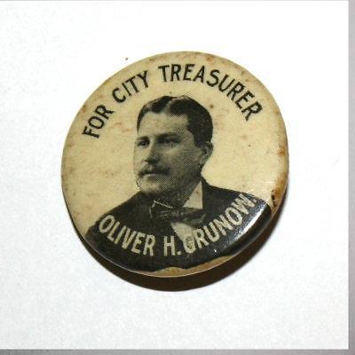 RARE DETROIT MICHIGAN CITY TREASURER CAMPAIGN CELLO BUTTON OLIVER GRUNOW 1890s