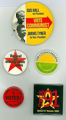 5 Vintage 1972-91 Communist Party USA Political Pinback Buttons - Vote Communist