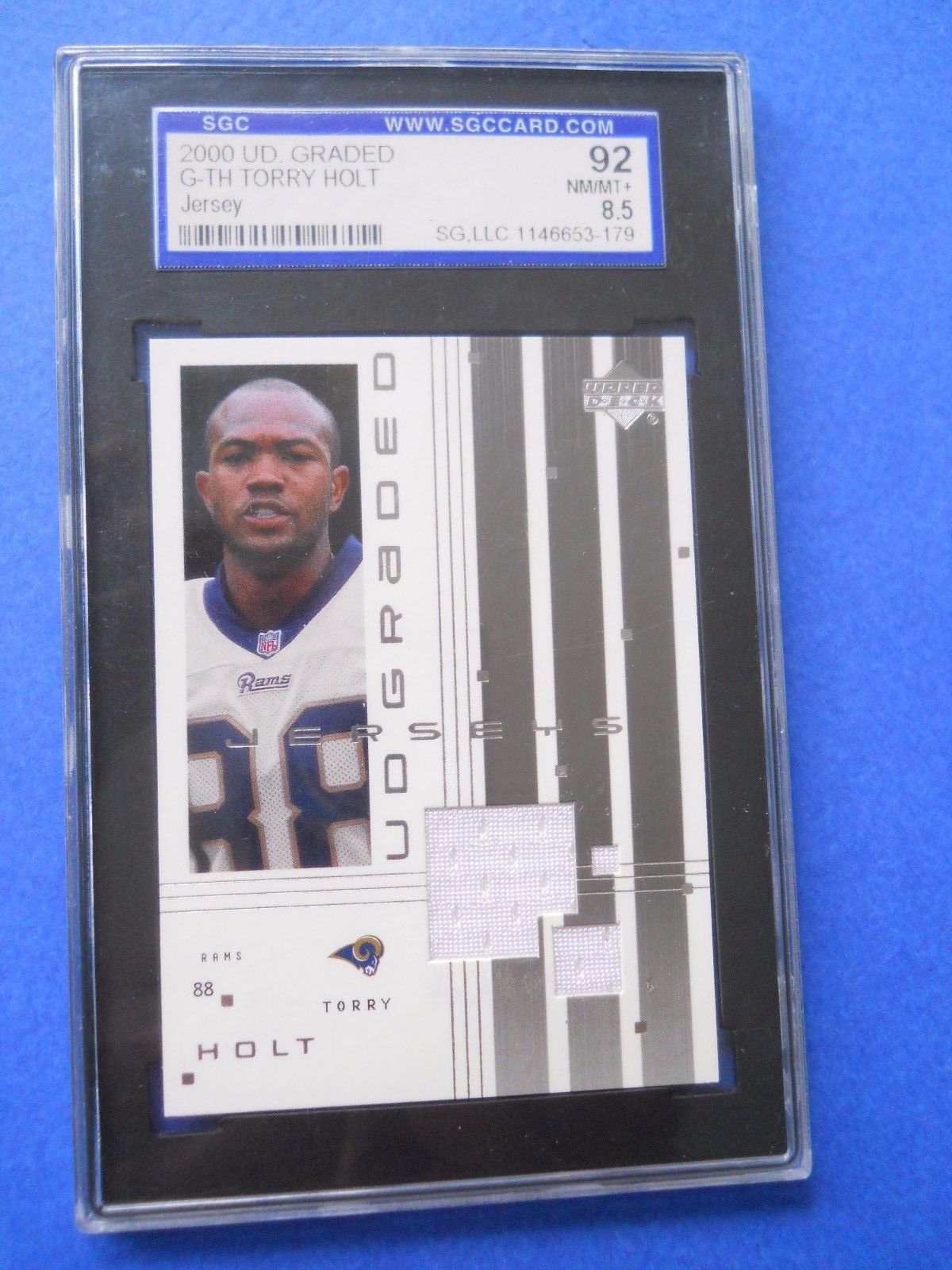 Title (ebay affiliate link): Torry Holt, 2000 U.D. Game-Used Jersey Football card # G-TH, Graded SGC 92
