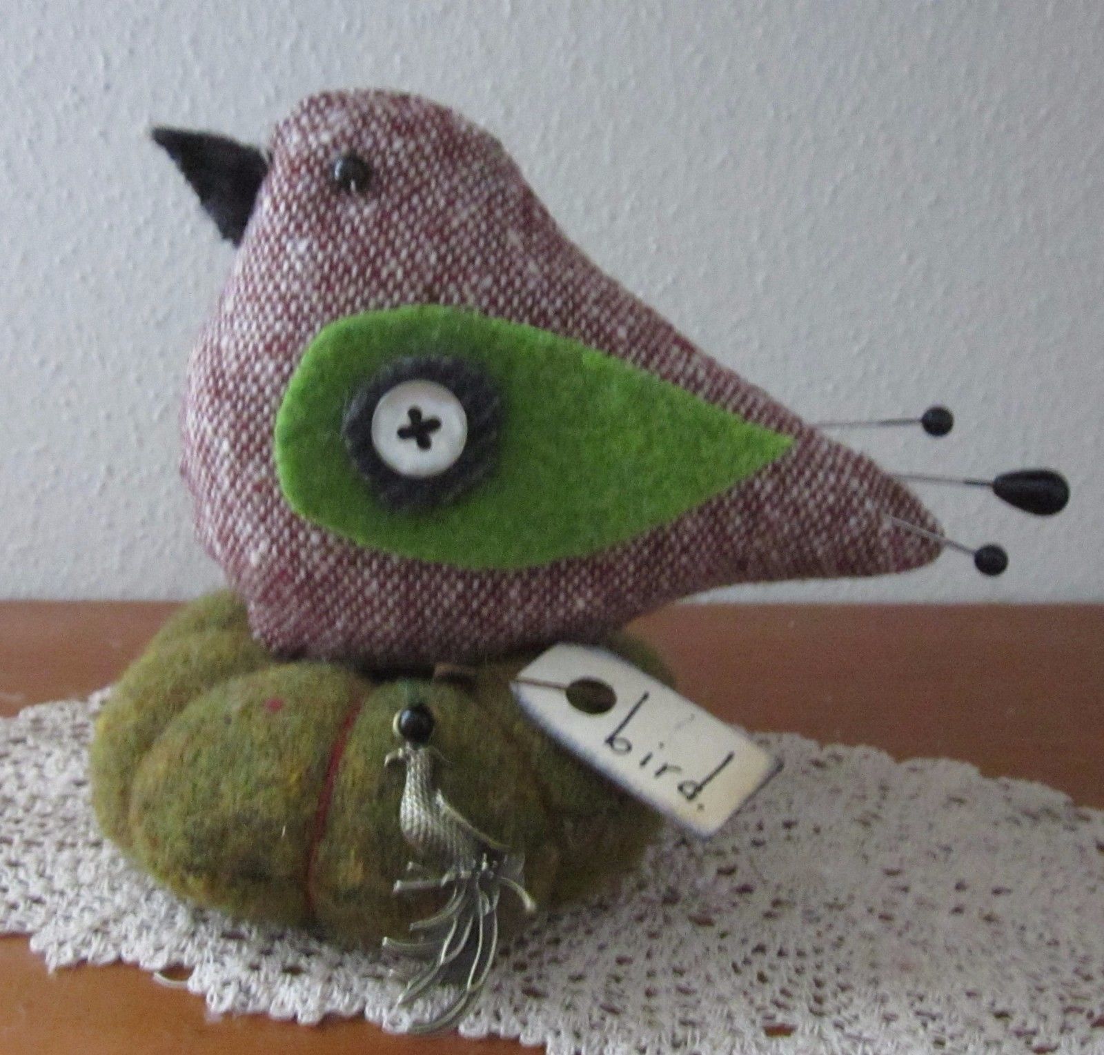 Title (ebay affiliate link): PRIMITIVE TWEED WOOL BIRD CHARM MAKE DO PIN CUSHION PFATT