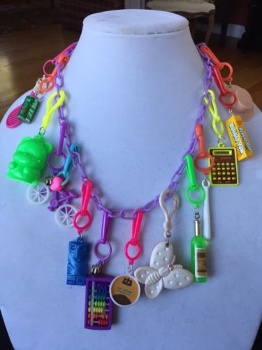 Title (ebay affiliate link): Vintage 80's New Plastic Bell Charm Necklace Retro Clip On 1980 Party! 14 Charms