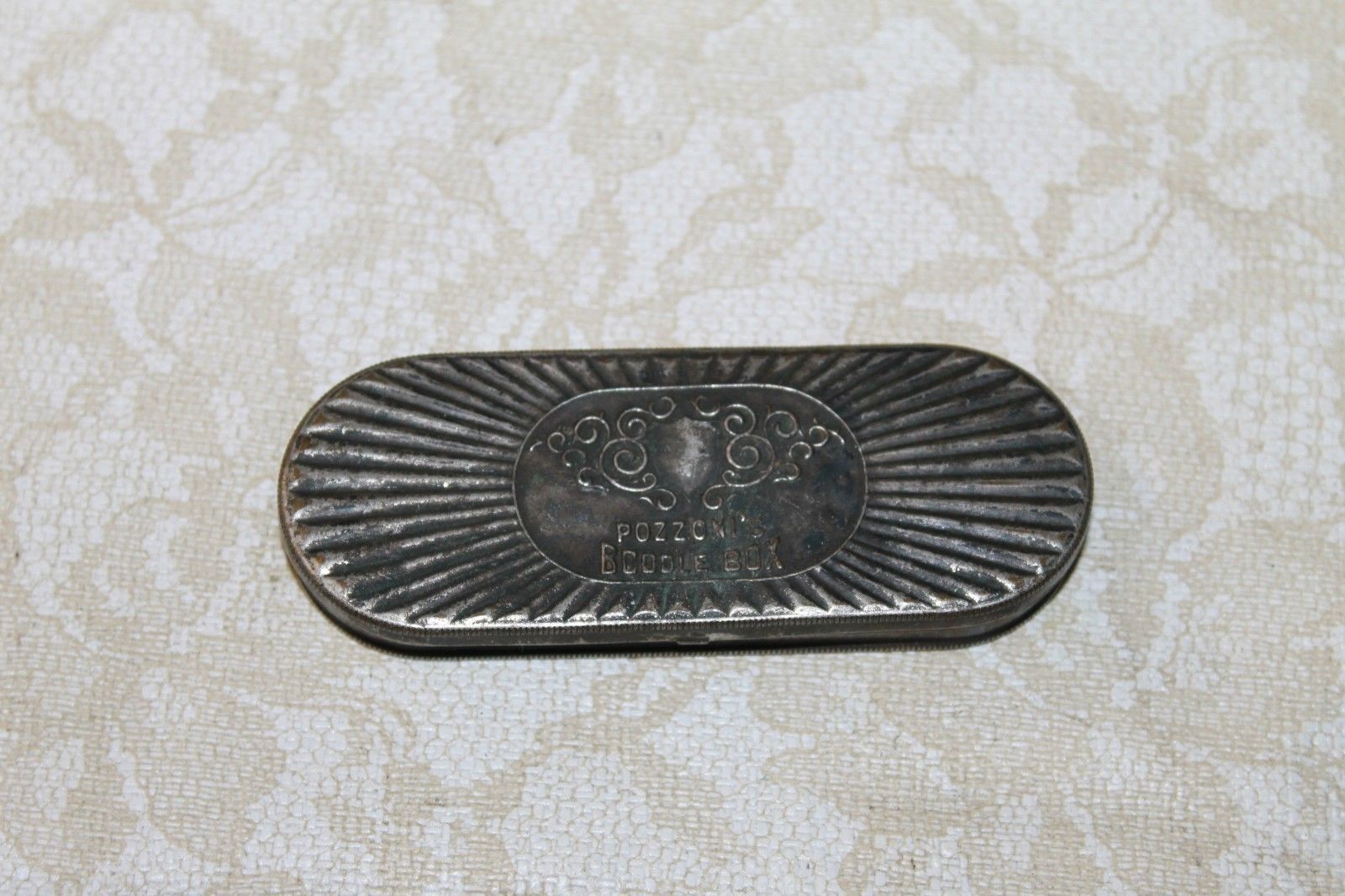 Title (ebay affiliate link): Pozzoni's Boodle box,tin hinged antique box container fancy scroll collectible