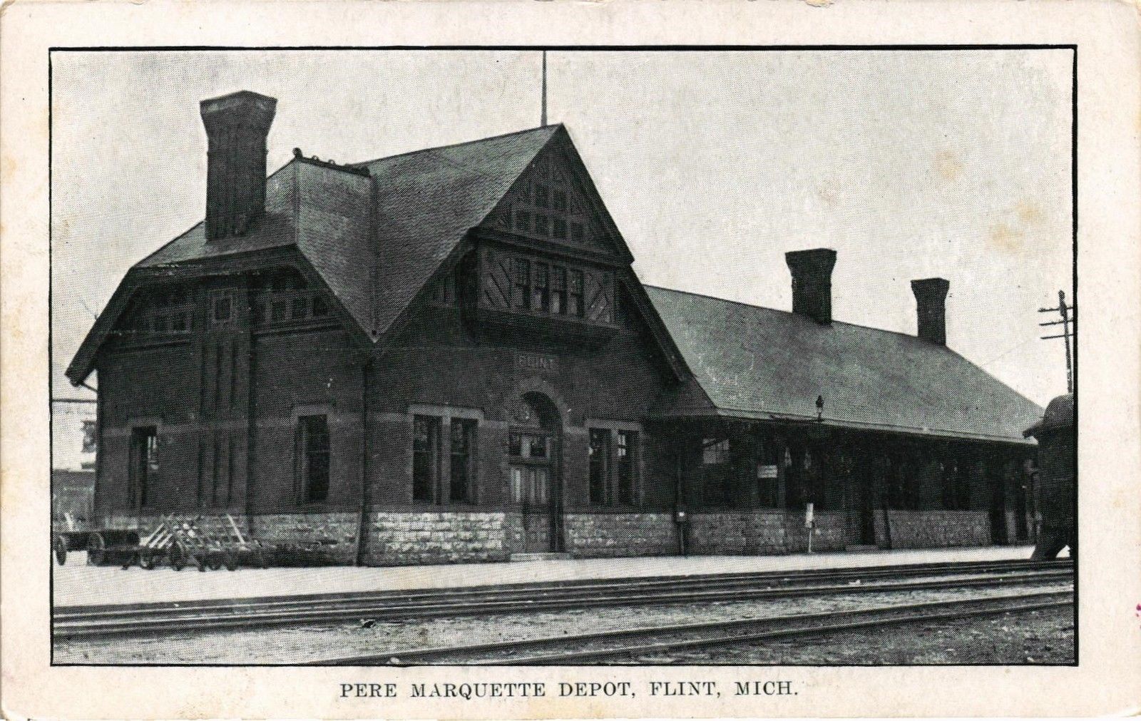 DR JIM STAMPS US PERE MARQUETTE RAILROAD DEPOT FLINT MICHIGAN POSTCARD
