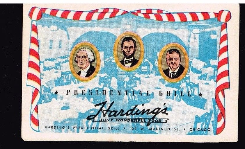 Teddy Roosevelt Washington Abraham Lincoln Chicago Harding's grill postcard.