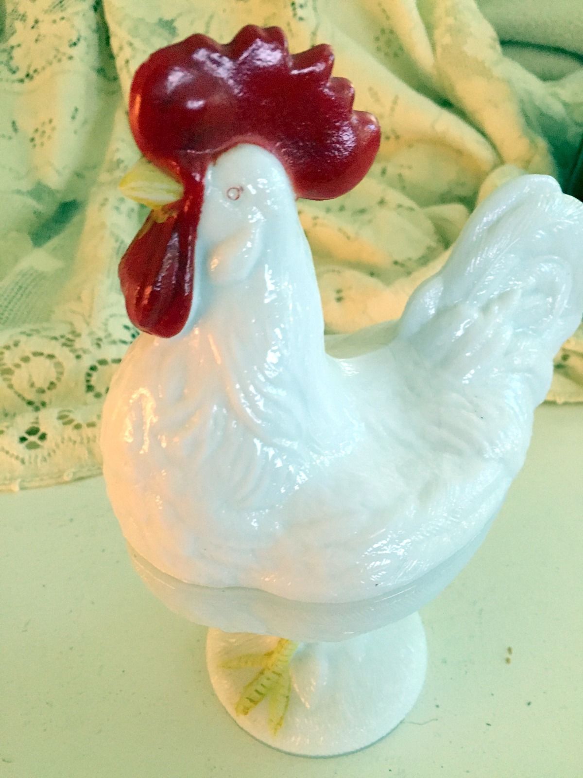 Title (ebay affiliate link): Vintage 'standing' Rooster covered Candy Dish White Milk Glass 9" high x 7" wide