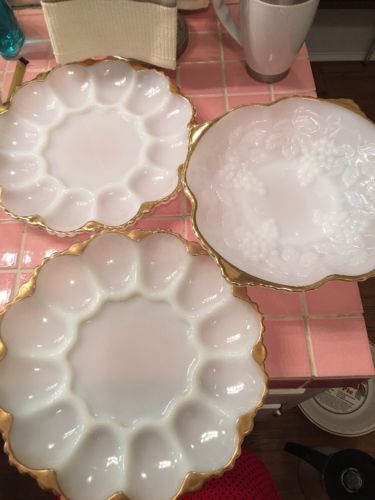 Title (ebay affiliate link): Vintage Anchor Hocking Deviled Egg Plate - White Milk Glass with Gold Trim Set 3