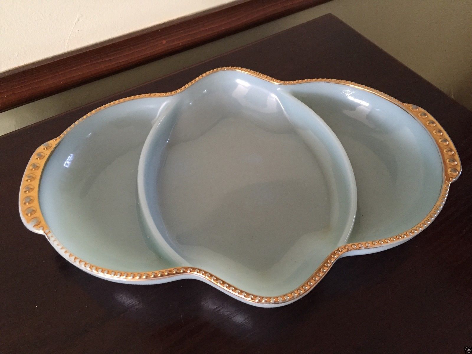Vintage Fire King Divided Relish Serving Dish Tray Blue Milk Glass w Gold Trim