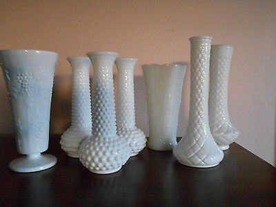 Title (ebay affiliate link): Lot of 7 White Milk Glass Vases 7",8" & 9" Great for Weddings & Showers