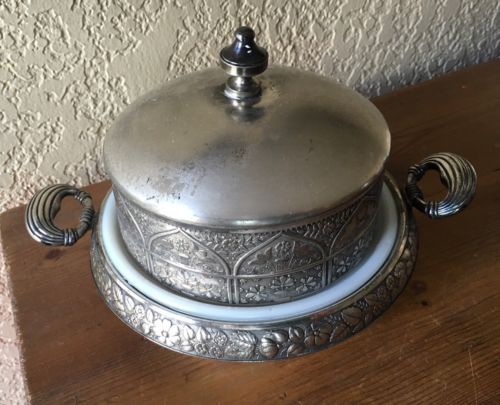 Title (ebay affiliate link): HARTFORD ANTIQUE SILVER PLATE BUTTER DOME AESTHETIC FLORAL MILK GLASS INSERT WOW