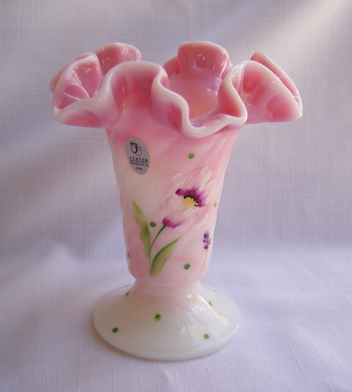 FENTON MILK GLASS FLORAL PINK CRIMPED EDGE VASE QVC