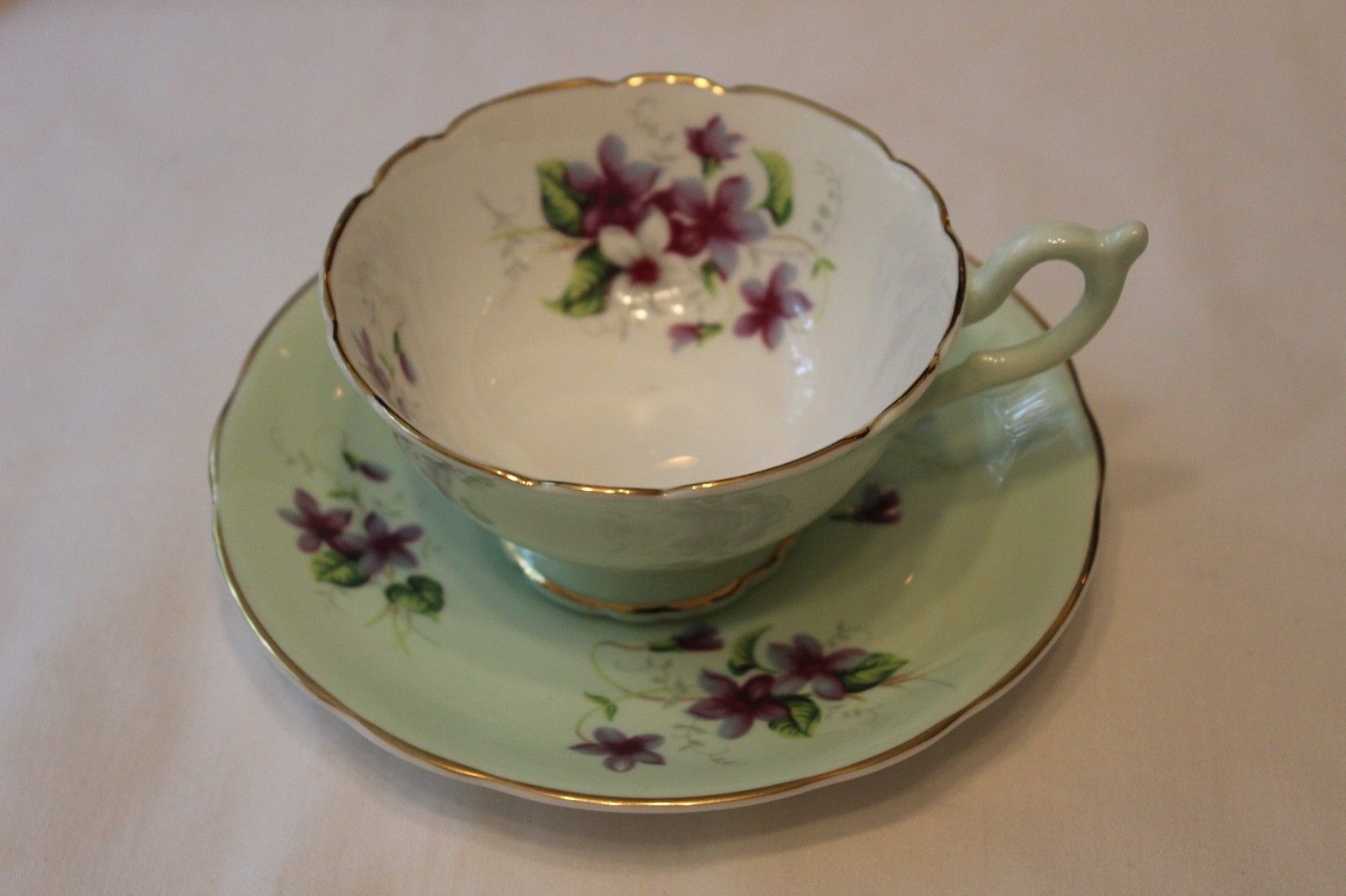 Title (ebay affiliate link): Vtg Heathcote England Bone China Tea Cup & Saucer Pale Green & Purple Violet
