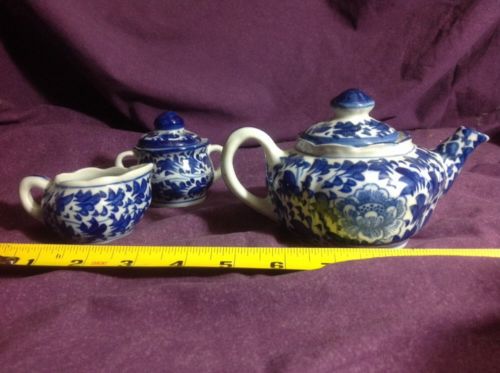 Vtg Ceramic Porcelain Play Doll Dishes Tea Pot Creamer And Sugar Blue And White