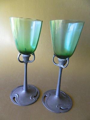 Beautiful Art Nouveau Emerald Glass & Pewter Stem Wine Glasses Jugendstil
