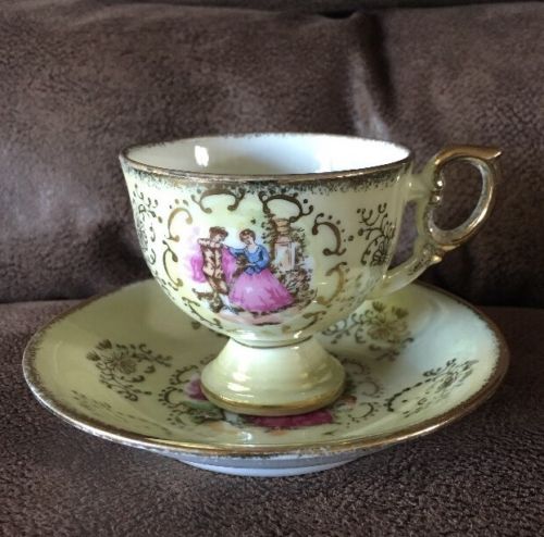Title (ebay affiliate link): Beautiful Footed Tea Cup and Saucer Victorian Couple Gold Trim