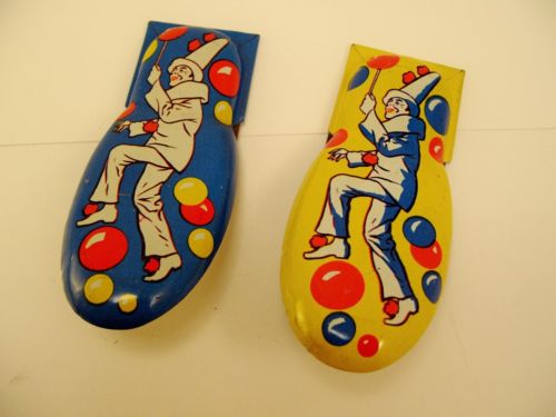 Vtg Metal Noise Maker Kirchhof Lot of 2 Clickers Clown and Balls Blue Yellow