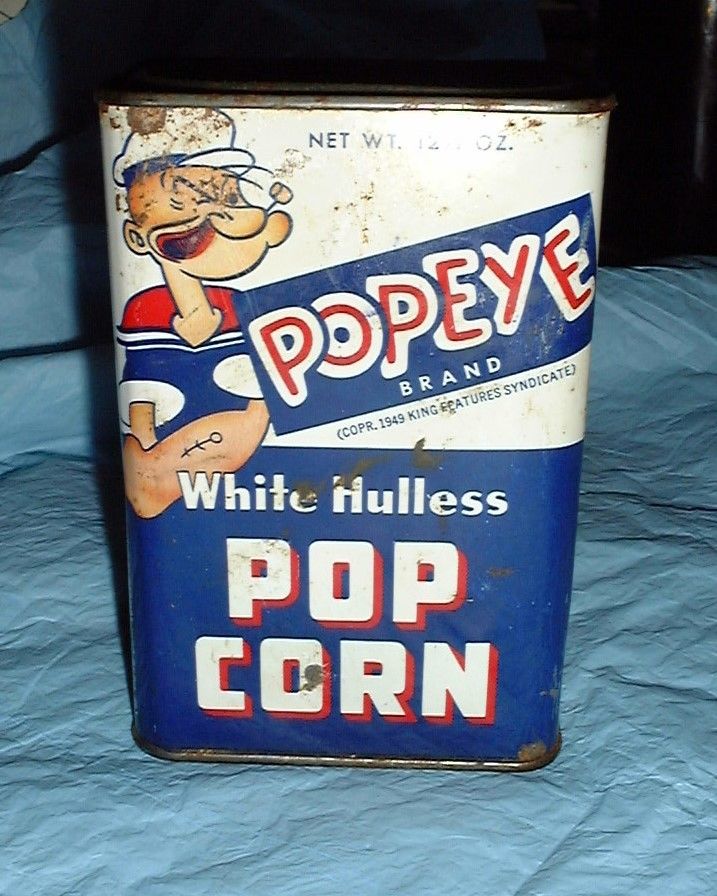 Title (ebay affiliate link): Vintage 1949 Popeye Brand Popcorn TinPURITY MILLS DIXON ILLINOIS WHITE HULLESS