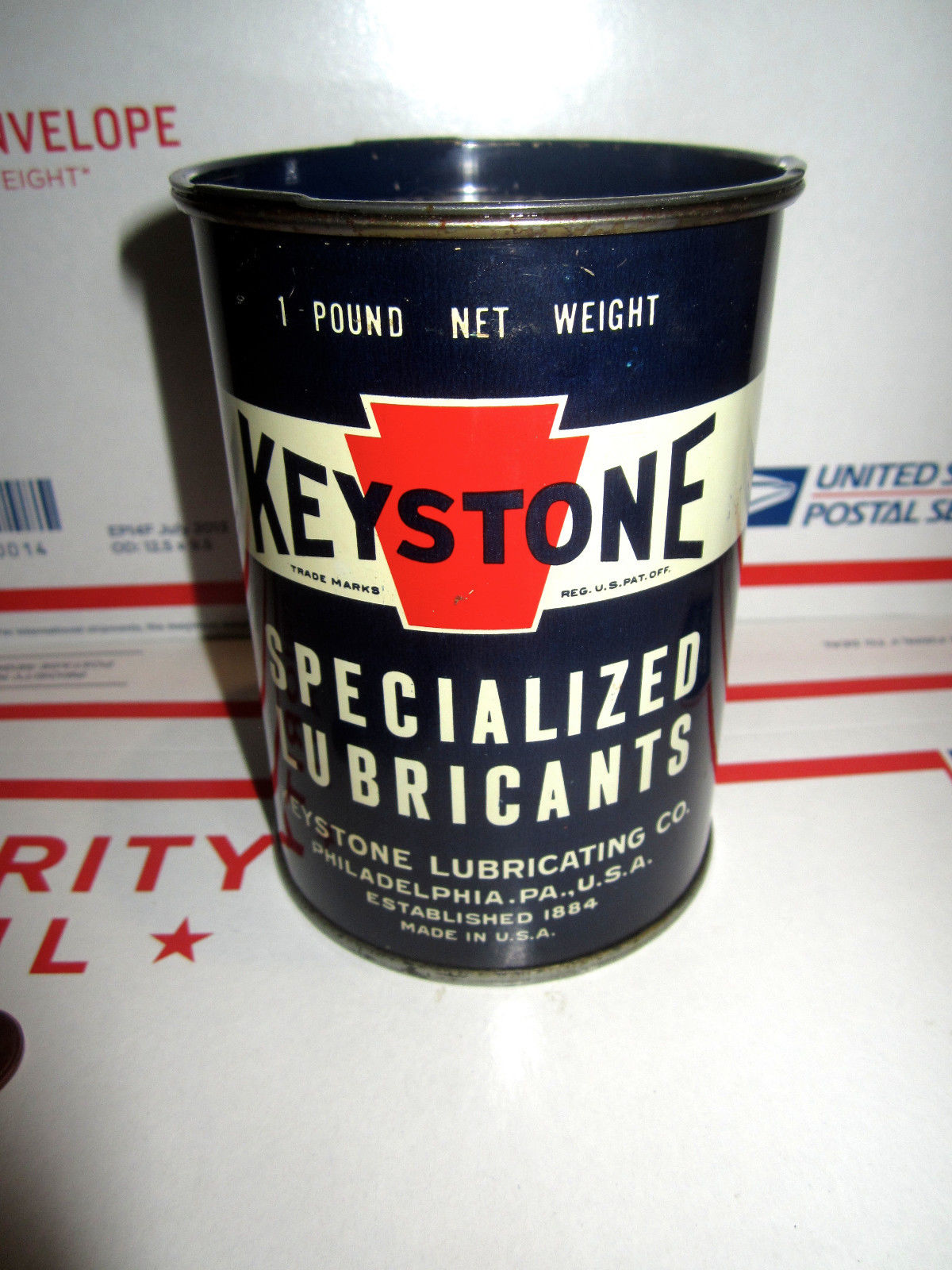 Title (ebay affiliate link): ANTIQUE/VINTAGE KEYSTONE LUBRICATING CO. TIN CONTAINER MEDIUM GREASE LUBE