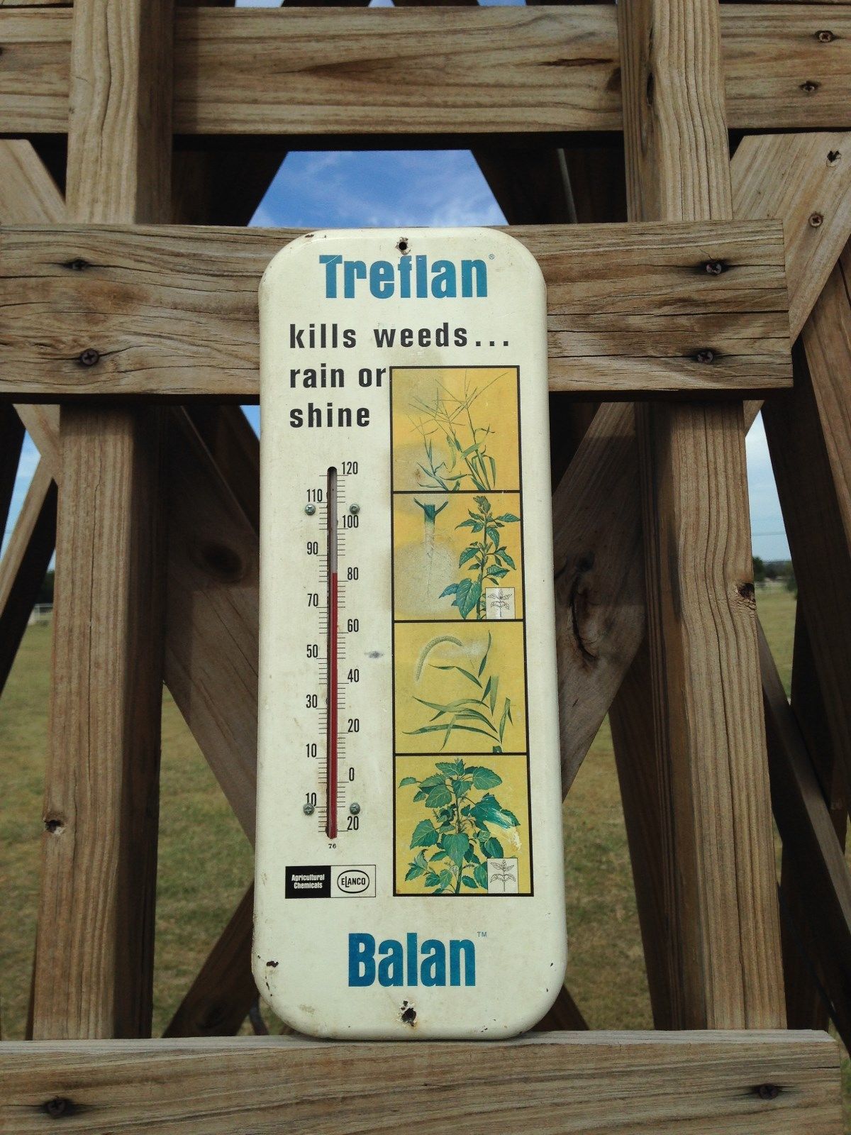 Title (ebay affiliate link): Treflan Garden Thermometer 1960's Fertilizer Feed Seed Metal Farm Barn Original!