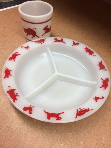 Title (ebay affiliate link): Vintage PYREX Fireking childs milk glass RED Animal divided grill PLATE & MUG!
