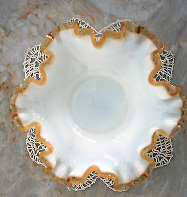 VINTAGE Milk Glass Candy Bowl with Amber Blown Glass Ruffle Rim Autumn Decor