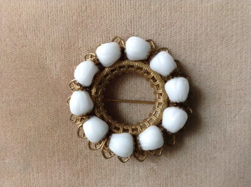 Miriam Haskell Circle Pin Milk Glass Beads Yellow Metal