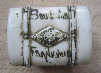 ANTIQUE MILK GLASS TRUNK CANDY CONTAINER w/ ORIGINAL TIN CLOSURE