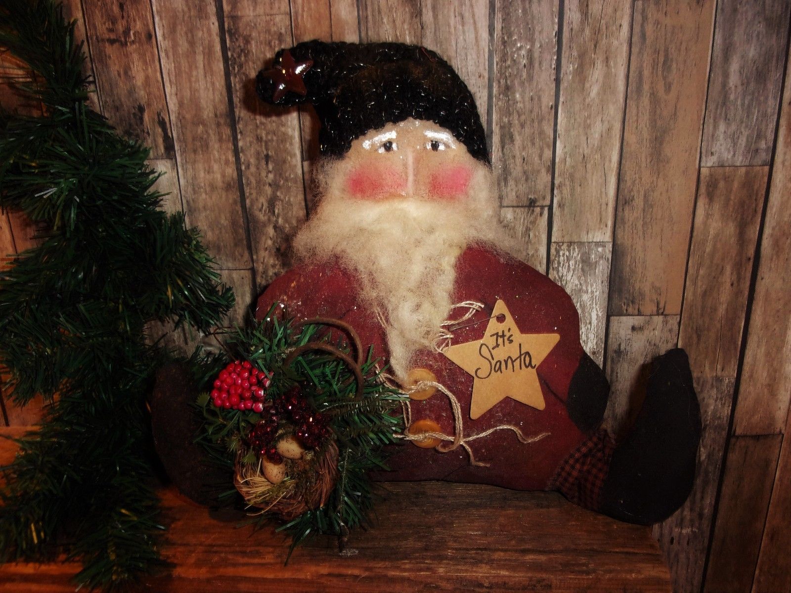 Title (ebay affiliate link): ** Primitive CHRISTMAS SANTA SITTING SPARKLED HOLIDAY 10X11IN Rusty doll **