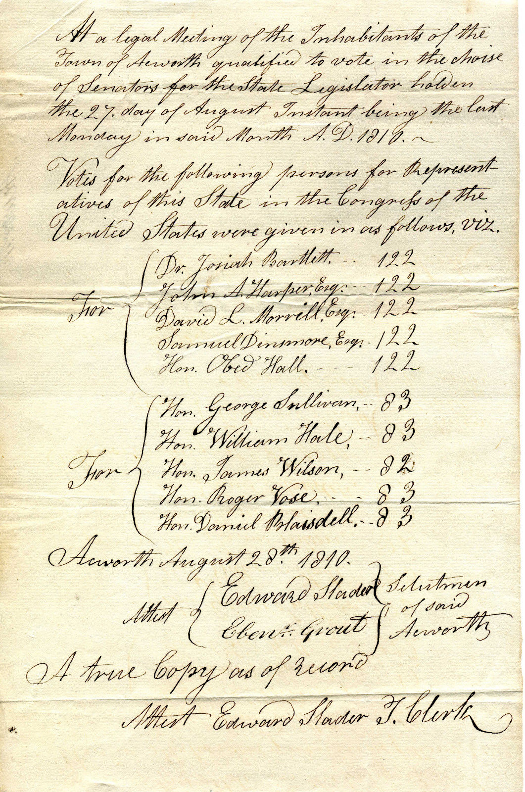 1810 REPORT OF VOTES FOR REPRESENTATIVES TO U S CONGRESS ACWORTH NEW HAMPSHIRE