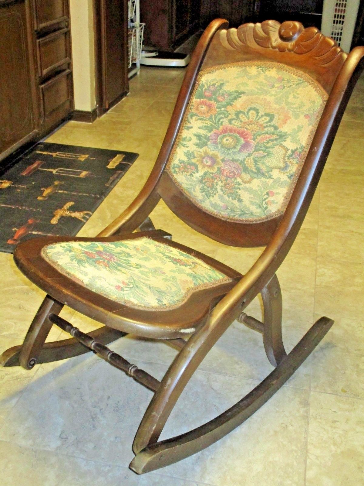 Title (ebay affiliate link): VINTAGE FOLDING ROCKING CHAIR, SEWING CHAIR WITH TAPESTRY SEAT & BACK