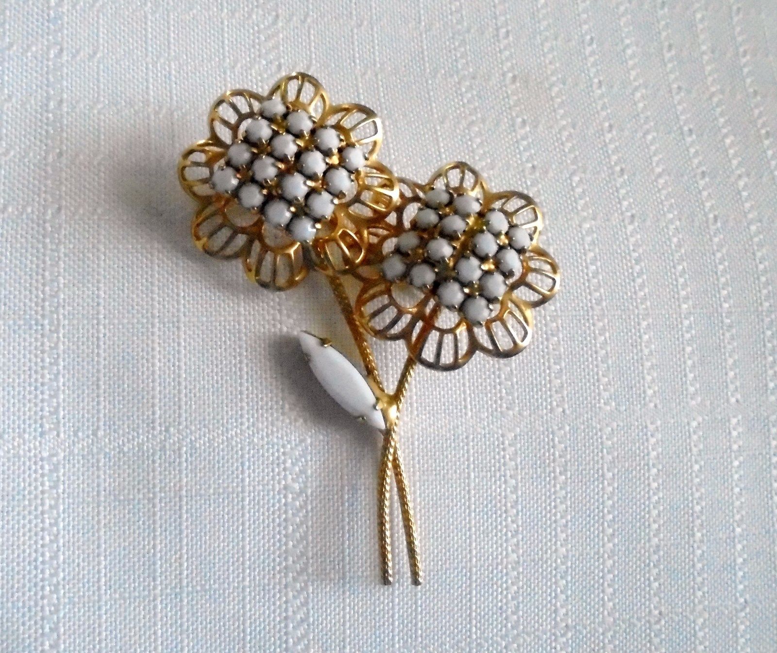 Title (ebay affiliate link): Very Pretty Vintage Gold Tone Flower Brooch with Milk Glass Stones