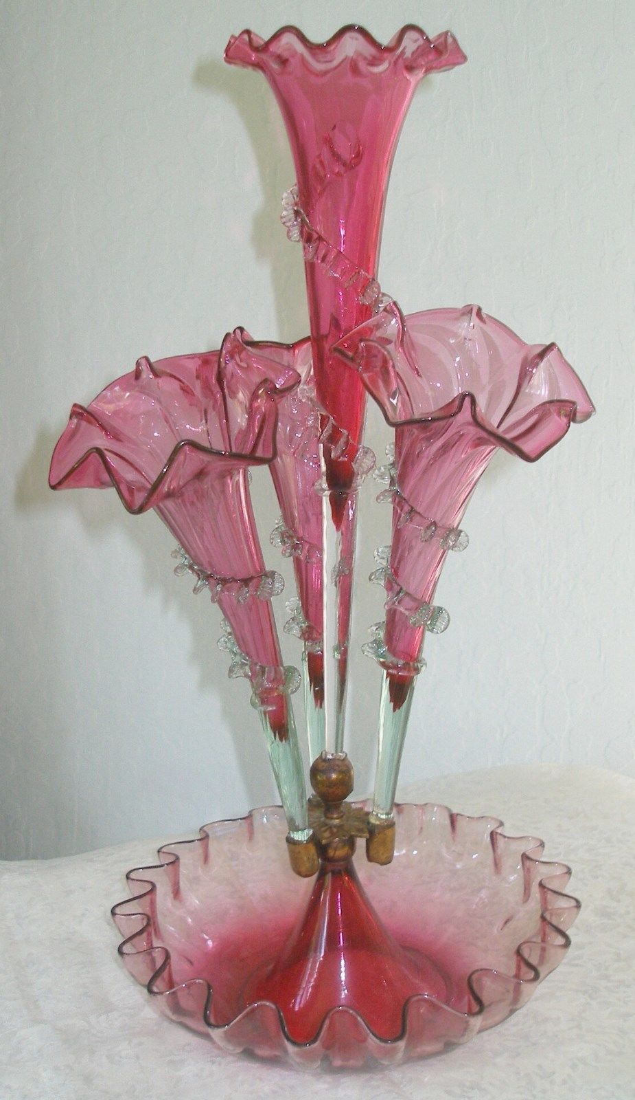 Title (ebay affiliate link): ANTIQUE CRANBERRY GLASS EPHERGNE - 4 TRUMPETS, 17 INCHES HIGH, 9 INCH BOWL