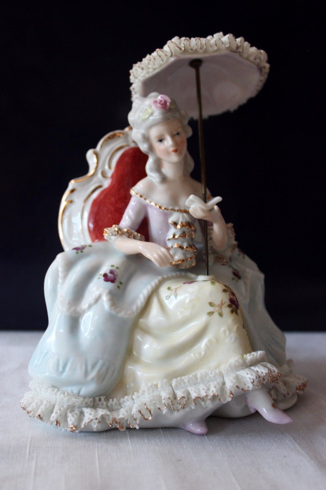 Title (ebay affiliate link): GERMAN DRESDEN LACE ~ KPM~ WOMAN WITH PARASOL AND BOOK 7" DOG cHARITY