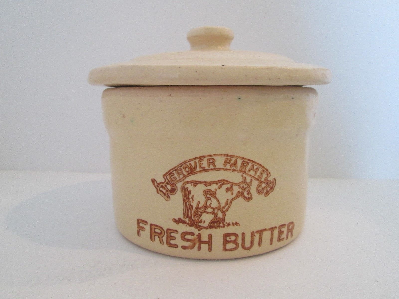 Title (ebay affiliate link): VINTAGE GROVER FARMS FRESH BUTTER 1LB. CROCK WITH LID { MILK MAID AND COW }